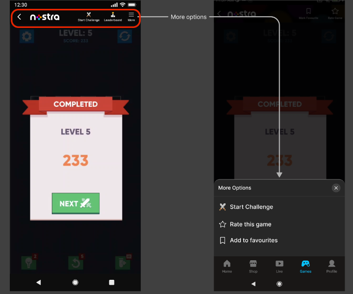 The navigation bar in Nostra provides players easy and consistent access to the Nostra features, such as the Start Challenge, Add to favorites, Leaderboard, and others. The navigation bar stays visible across all the game screens, and players can navigate to different pages at any stage of the game.